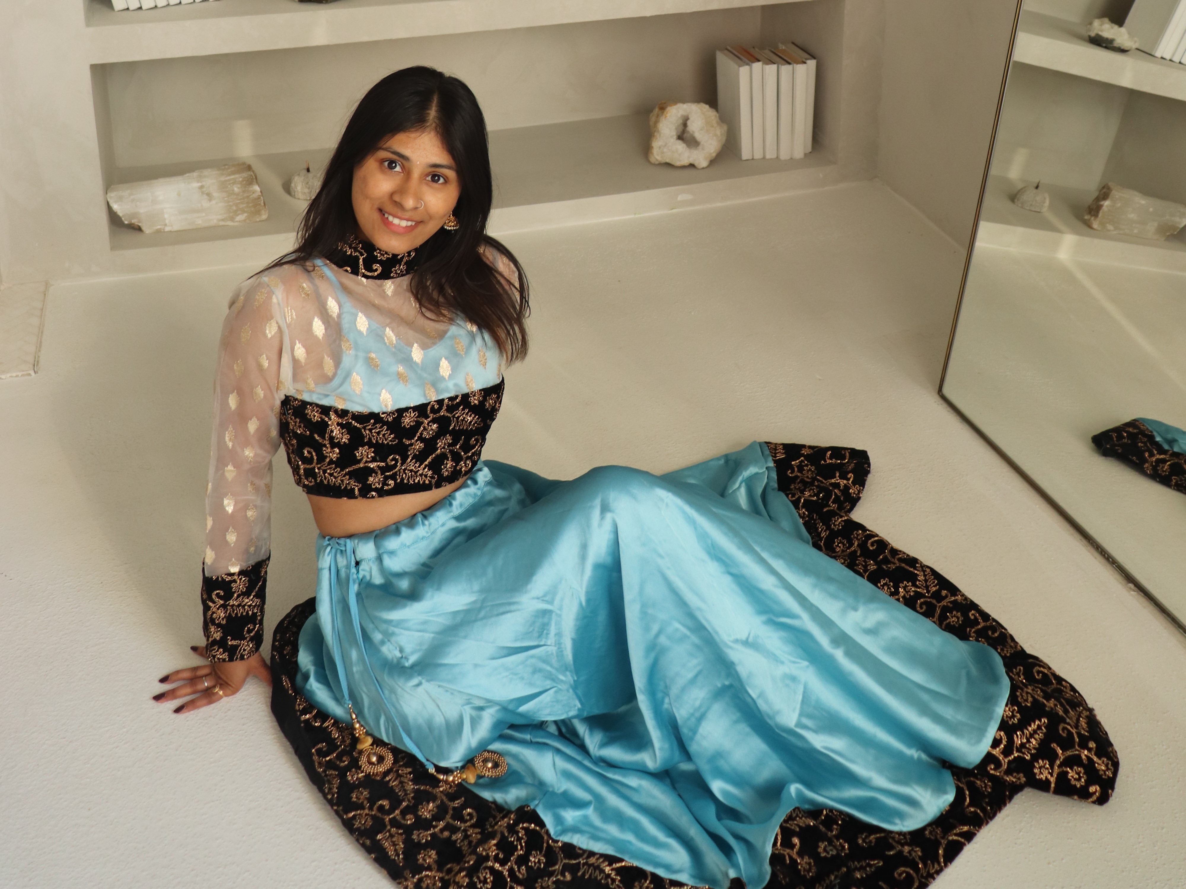 At Meera Designs, we believe in the magic of handcrafted artistry. Every garment is hand-designed and created by the brand owner. The journey begins with the careful selection of high-quality materials sourced from India, ensuring authenticity and sustainability.