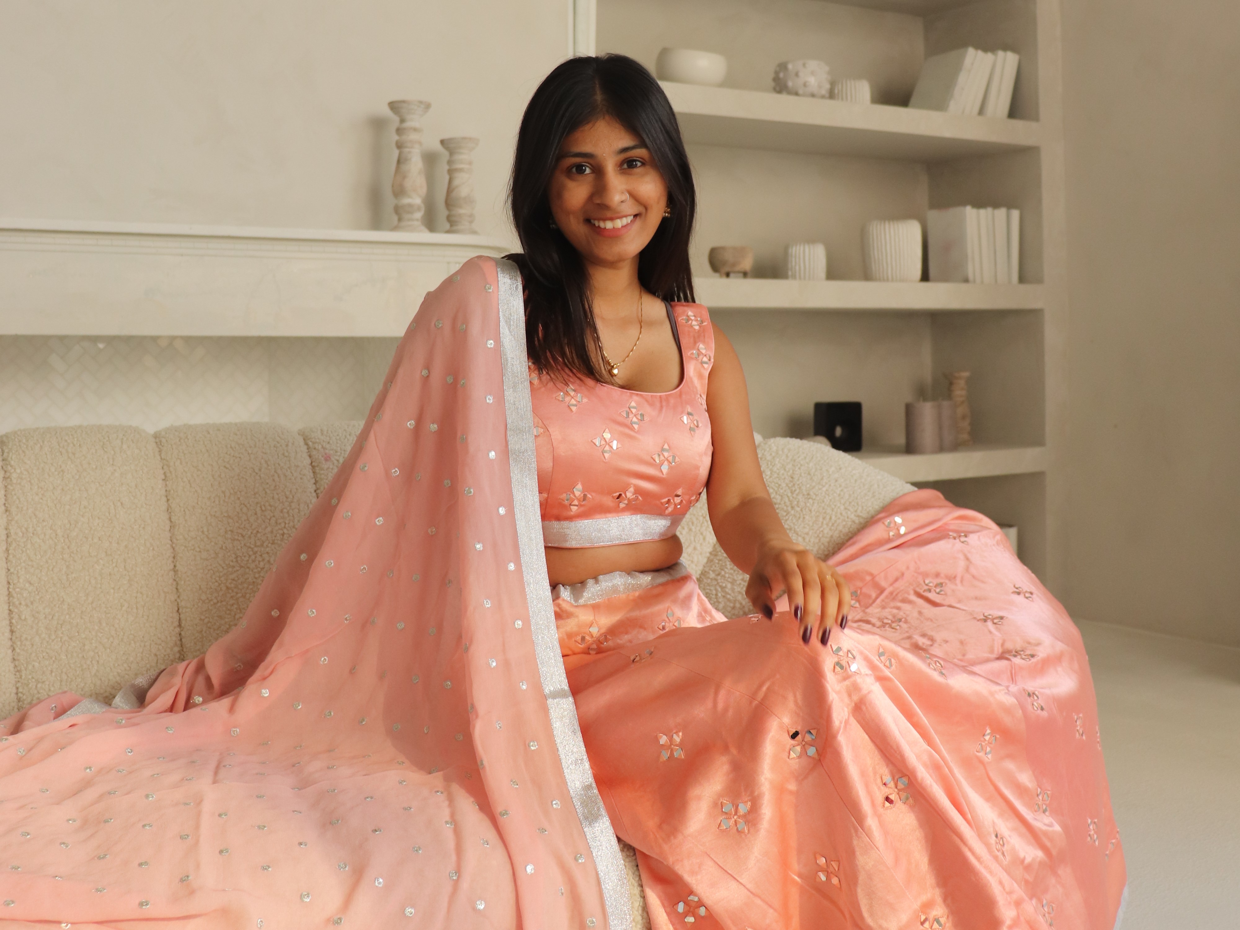 After this meticulous process, your carefully crafted lehenga will be delivered to you, ready to be worn at any special occasion. Whether it’s a family Diwali party or a vibrant sangeet dance event, or garba, our simple party wear lehengas are designed to make memories that last a lifetime.
