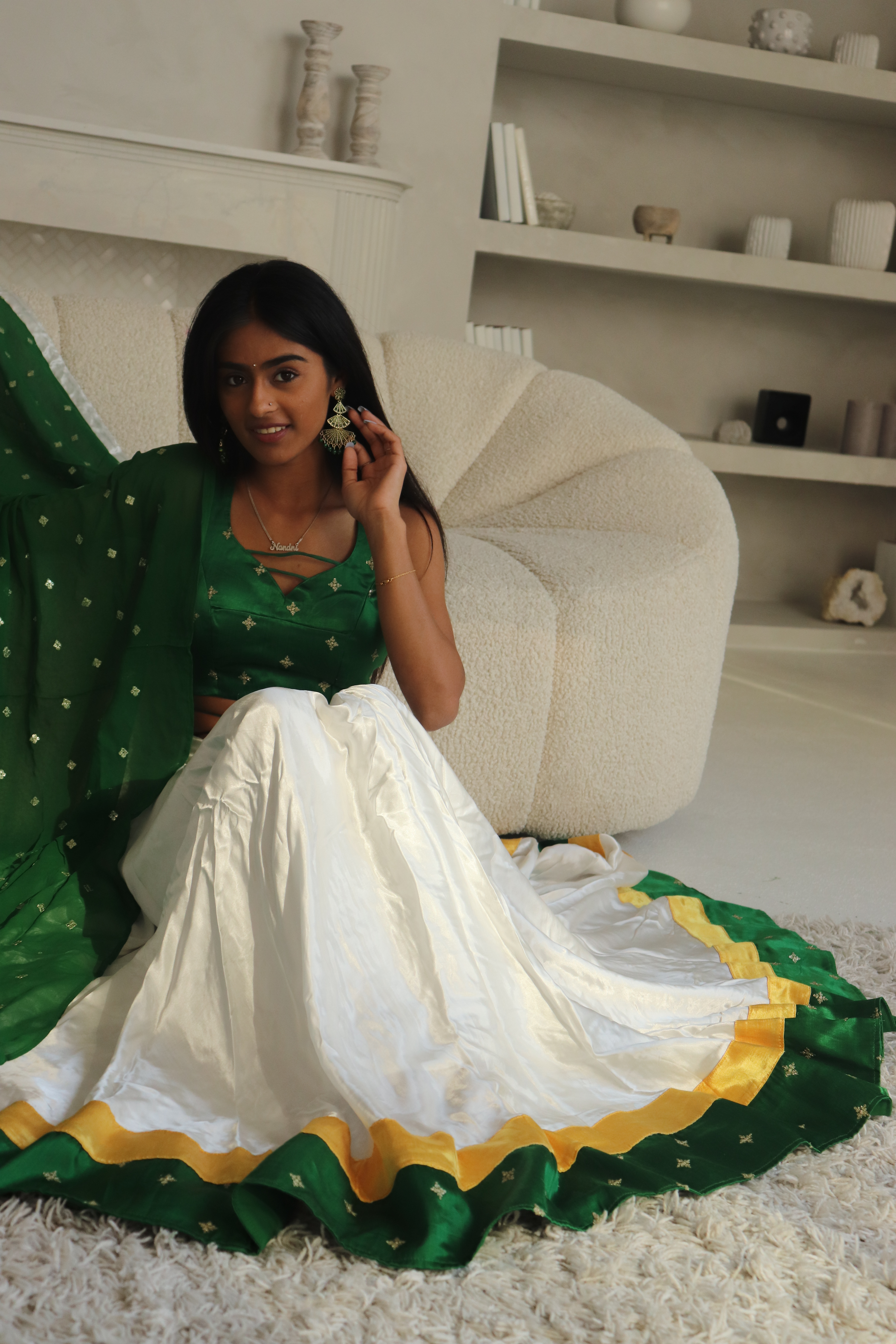 The pure white Gaji silk skirt exudes purity and sophistication, while the contrasting gold and emerald green borders elevate the overall aesthetic, creating a harmonious balance of colors. This ensemble is designed to make a statement on any special occasion, ensuring all eyes are on you.